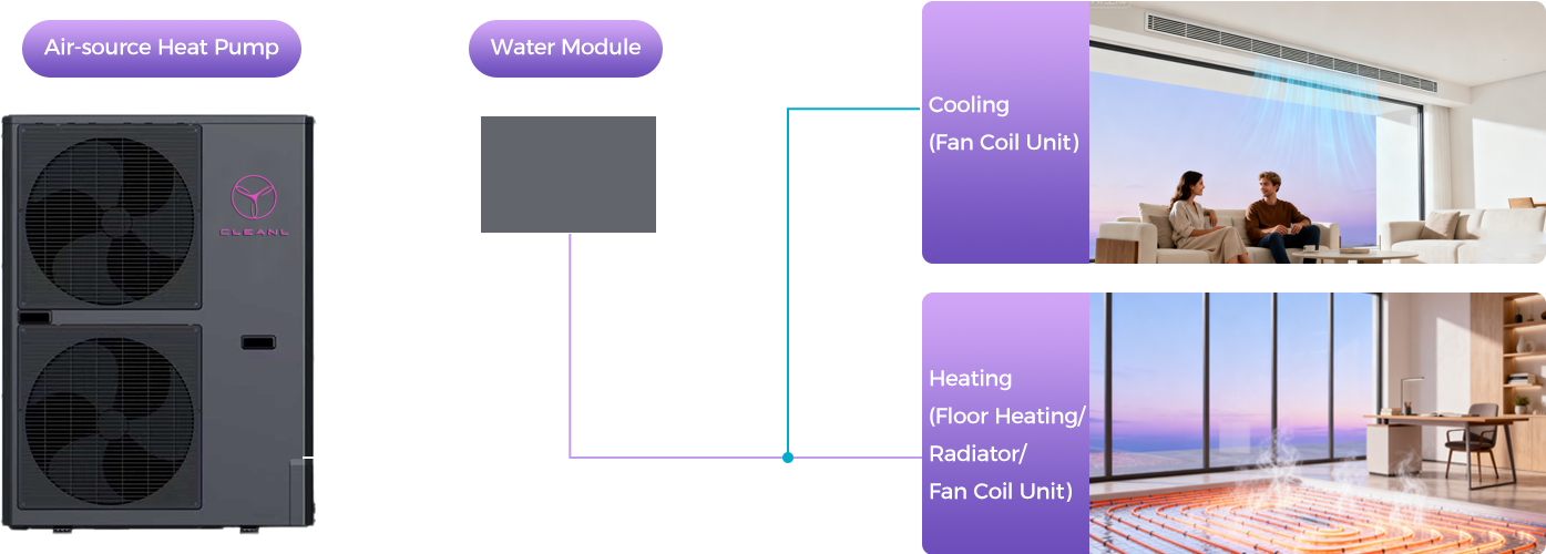 Cleanl’s air source heat pump technology absorbs energy from outdoor air and utilizes free natural resources to cool or heat indoor air with minimal electric energy.